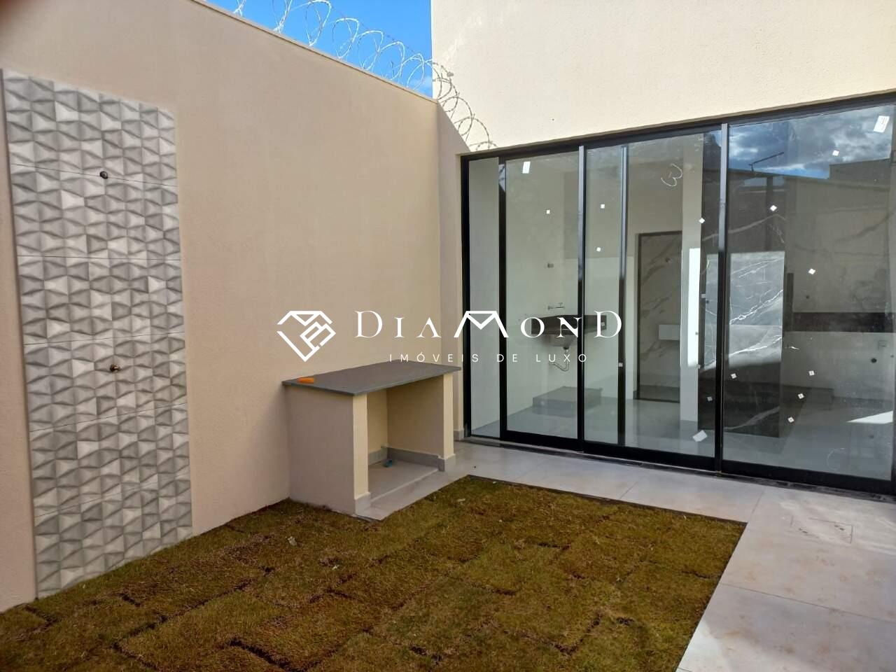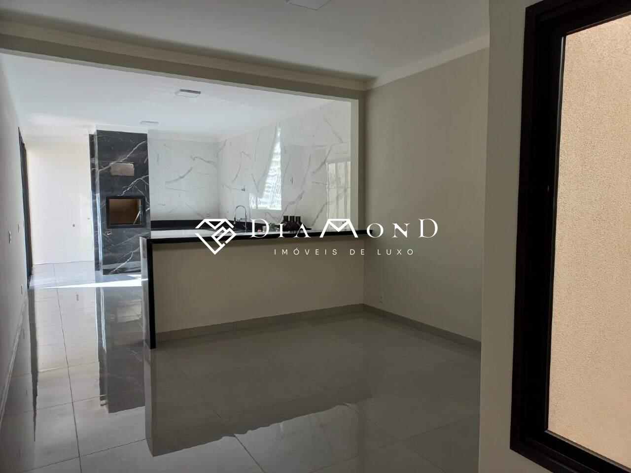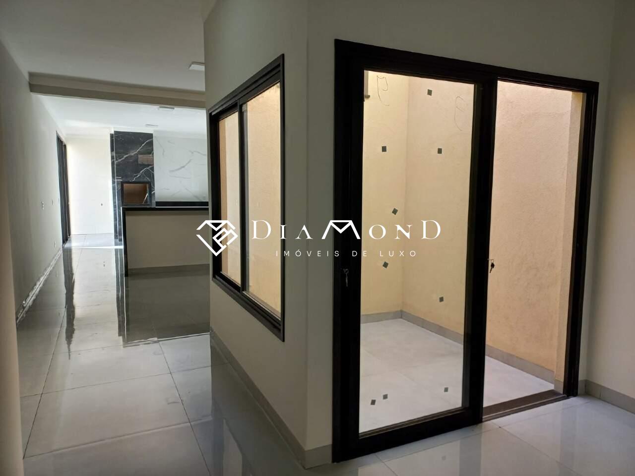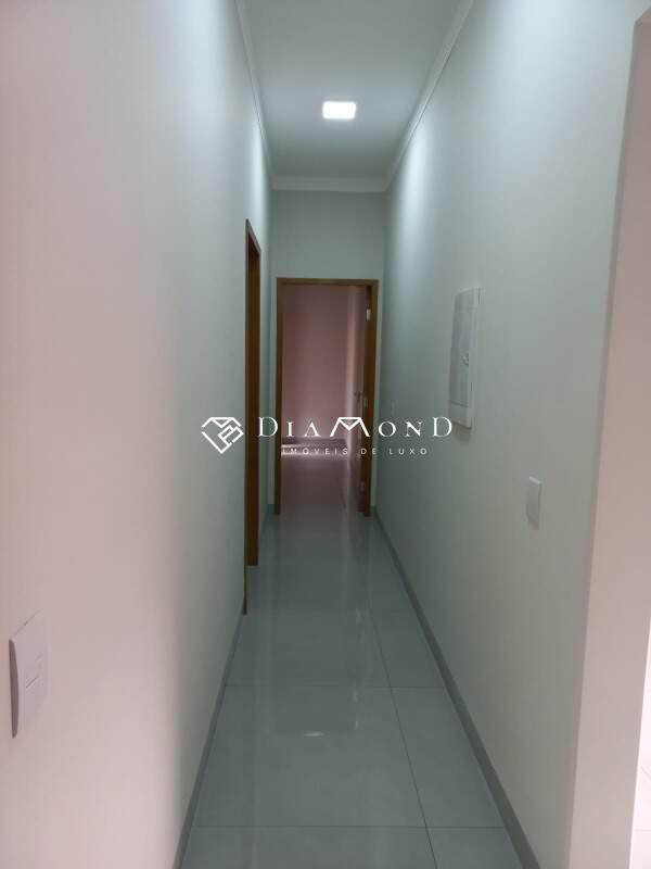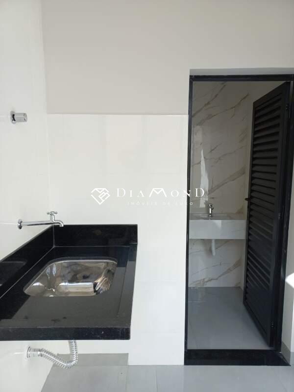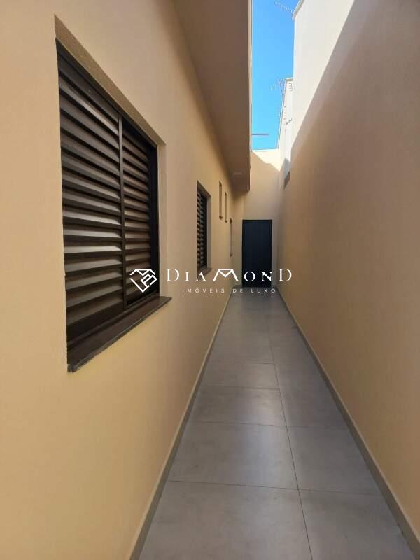 Casa nova com garagem para dois carros e espaço adicional para motos, sala com pé direito de 4 metros e sanca de gesso, jardim de inverno integrado, copa e cozinha conjugadas com espaço gourmet e churrasqueira, bancadas em granito preto São Gabriel, revestimento da cozinha em placas de 60x120 cm, lavabo, área de serviço funcional, três quartos, todos suítes com banheiros equipados com pias esculpidas e pontos para água quente. O acabamento é de alto padrão, incluindo porcelanato polido 84x84 cm, rodapés embutidos e esquadrias de alumínio. A casa também possui pontos para instalação de ar condicionado nos quartos, vídeo porteiro, muro com concertina para segurança, e portão basculante de 5 metros com motor. A área construída é de 186 m² em um terreno de 250 m².